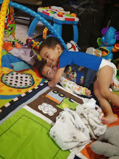 Speaking of my 2 little boys... big news now is that Lincoln is officially CRAWLING!! And when I say crawling... I mean he is crawling EVERYWHERE! He used to just stay in the living room. That is, until a few days ago when he discovered that there is life and room all throughout the house. Did I mention that everything goes into his mouth as well? I swear, there could be a tiny piece of paper 20 feet from him and he finds it! How do they do that? So, I've been CONSTANTLY vacuuming and cleaning to keep that little man safe. Oh & he's pulling up now too. Yeah, he thinks he's big stuff. I was prepared for this. I knew that he would catch on much faster since he has Gabriel to show him. But I wasn't prepared for him to go straight from crawling to standing. Tonight he even stood up and let go of the table and stood there for a few seconds on his own. MAN OH MAN! I've got a lot of work cut out for me.